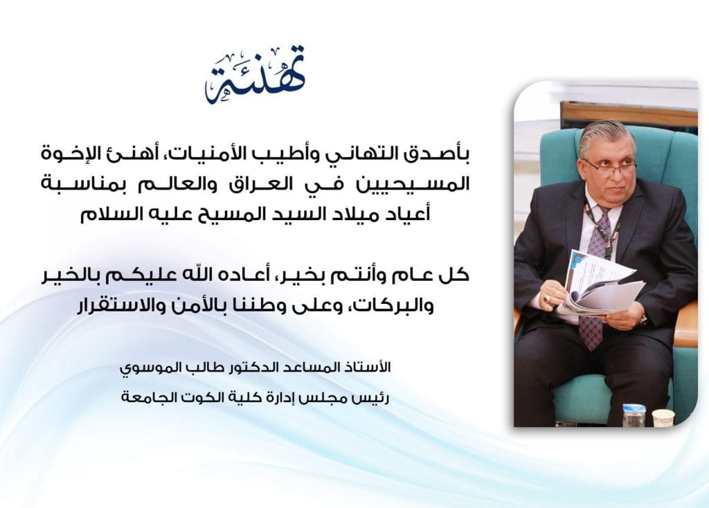 السيـد رئيـس مجلـس إدارة كليـة الكـوت الجامعـة الأستـاذ المساعـد الدكتـور طالـب الموسـوي ؛ يهنـئ الأخـوة فـي المكـون المسيحـي بمناسبـة أعيـاد الميـلاد المجيـدة .
