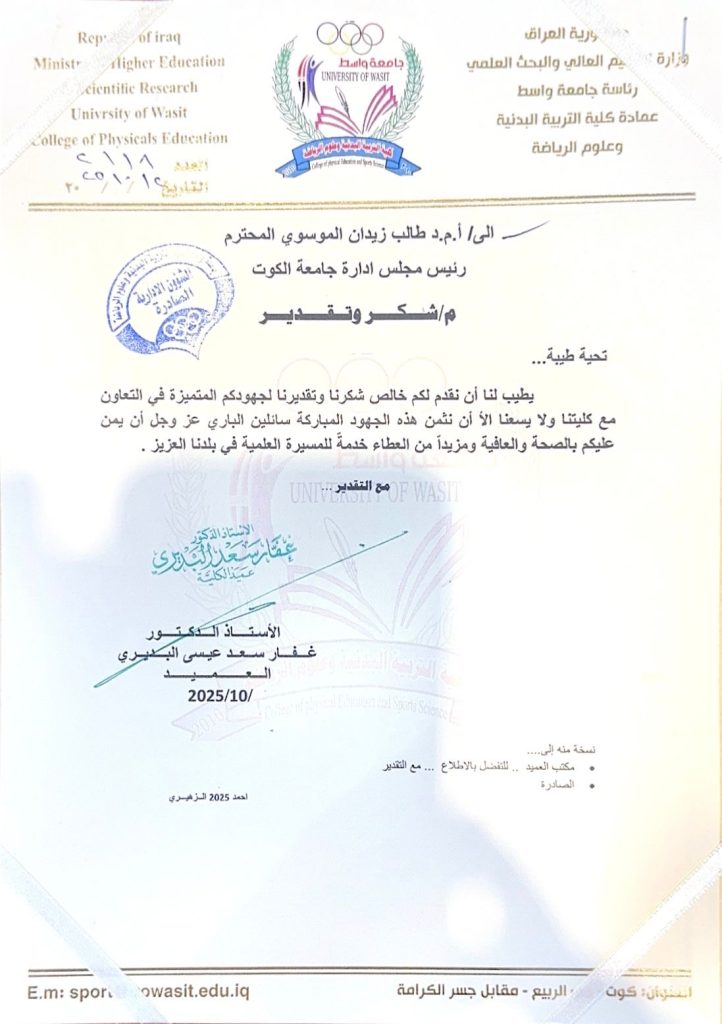 كلية التربية البدنية وعلوم الرياضة في جامعة واسط تهدي درع الشكر والتقدير لرئيس مجلس إدارة جامعة الكوت.